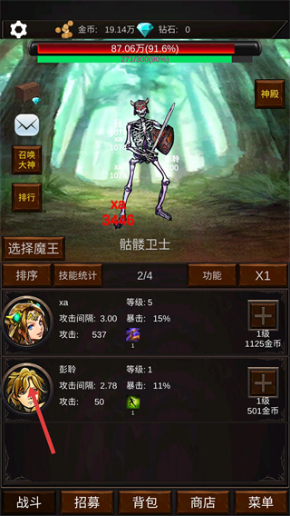 1、在主界面可查看已招募的伙伴如彭聆,伙伴會輔助攻擊當前魔王骷髏衛士,提升戰斗效率。