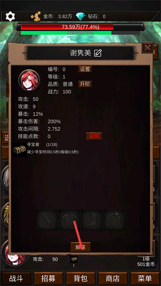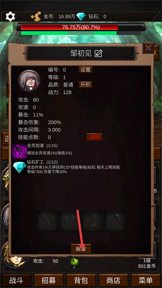 2、查看新伙伴鄒初見的詳情,其攻擊、暴擊等屬性更優,可解雇舊伙伴以增強隊伍整體戰力。