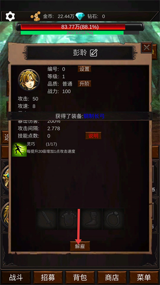4、點擊伙伴彭聆進入詳情界面,可查看其屬性與技能,點擊解雇可移除該伙伴,優化隊伍配置。