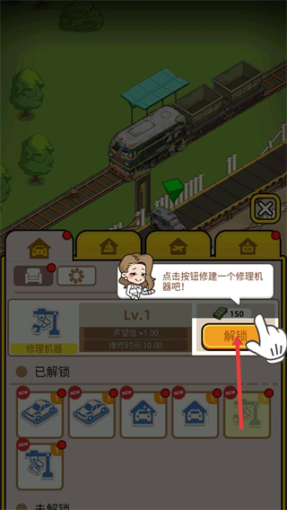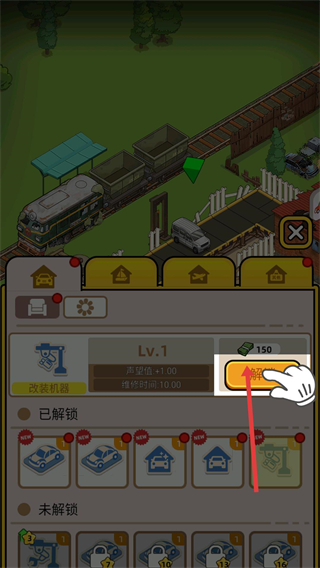 3、在設施界面點擊解鎖按鈕,消耗150資源解鎖修理機器,該設施可提升車輛的維修效率與價值。