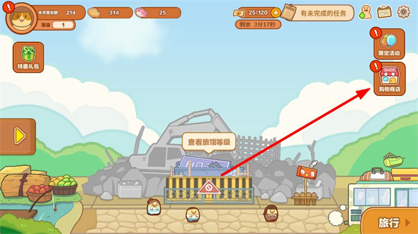 1、主界面查看旅館等級相關提示,點擊右側裝扮商店按鈕,可進入裝扮相關的功能頁面,獲取店員裝扮等內容。