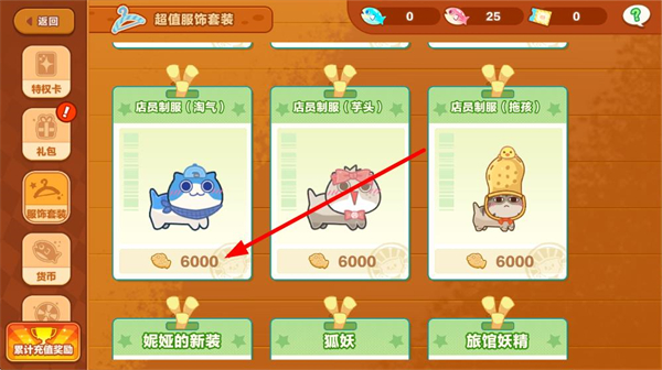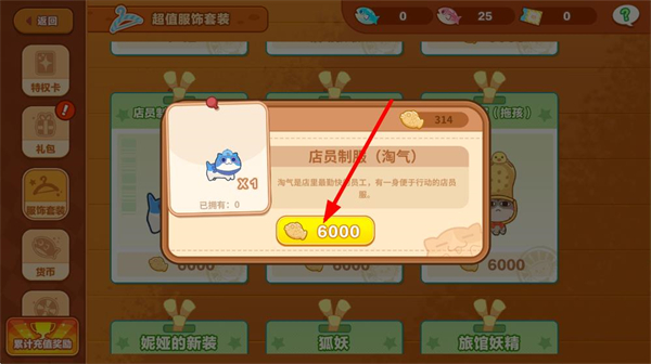 2、進入超值服飾套裝頁面,可查看各類店員制服裝扮,選擇目標裝扮后,可通過消耗對應道具來解鎖該裝扮。