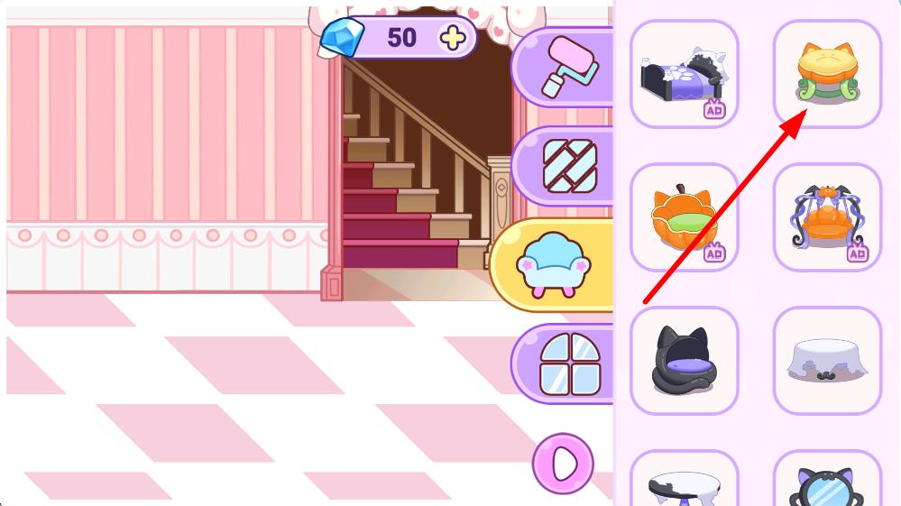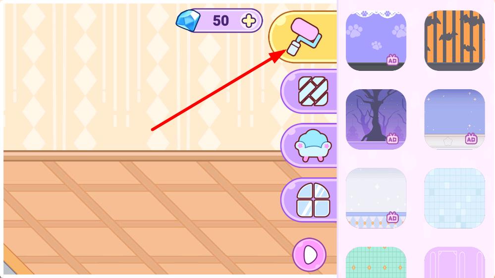 4、切換至墻面裝修選項,右側選擇目標墻面樣式,點擊即可更換場景內的墻面風格,豐富裝修效果。