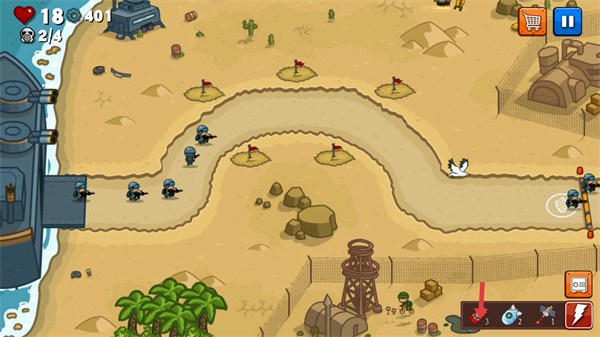 1、點擊開始按鈕進入游戲,該作是海島主題的塔防玩法,核心目標是部署防御塔抵御敵人進攻。