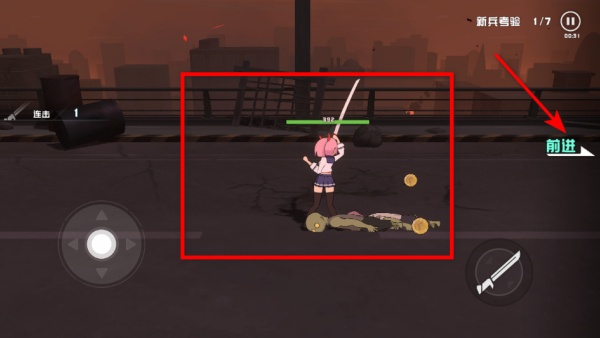 2、擊敗當前區域的敵人后,點擊前進按鈕移動到下一個區域,繼續清理該區域的敵人,收集更多金幣。