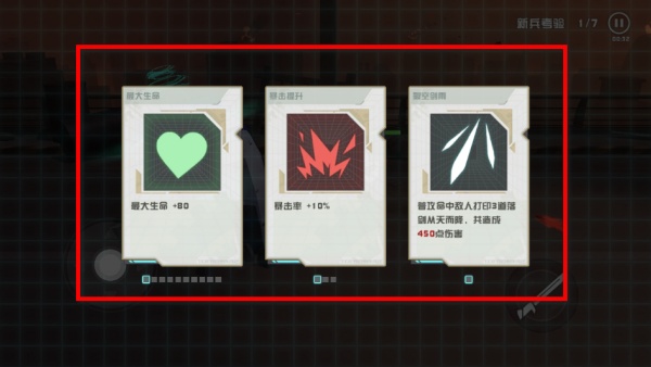3、完成階段性戰斗后,會解鎖能力選擇界面,可從提升生命暴擊或新增技能等選項中挑選一個。