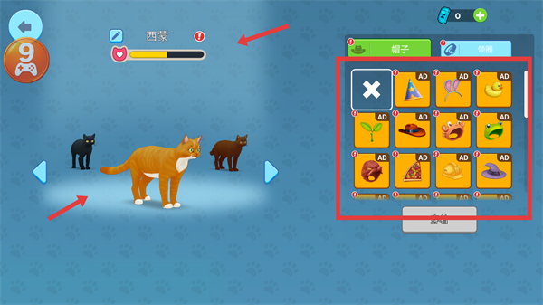 1、進入貓咪選擇界面,選定目標貓咪如橘貓西萊,搭配右側裝飾帽子,可個性化裝扮貓咪。