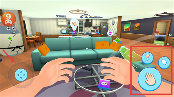 2、在房間場景中通過底部操作按鈕如移動、互動與物品交互,可收集道具,推進游戲流程。