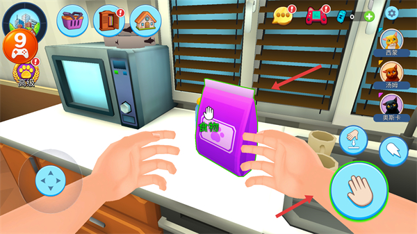 3、在廚房場景中,通過互動操作獲取貓咪用品,這是喂養貓咪、提升親密度的關鍵道具。
