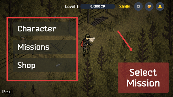 2、進入生存模式后,可通過左側菜單管理角色、查看任務、進入商店,點擊SelectMission選定任務開始挑戰。