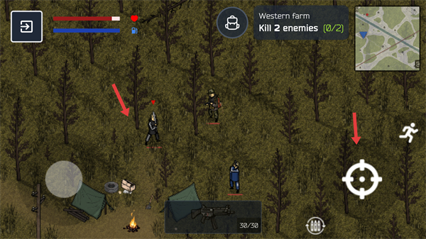 3、任務場景中通過移動左側按鈕和射擊右側瞄準鍵攻擊敵人,完成任務目標,同時需注意自身生命值狀態。