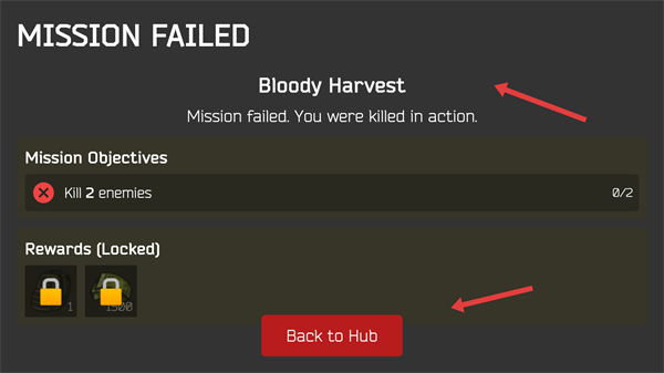 4、若任務失敗,會顯示Missio界面,點擊BacktoHub返回主場景,可調整裝備后重新挑戰任務。