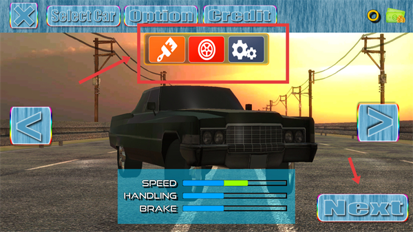 1、在車輛選擇界面,可查看當前車輛的屬性,點擊NEXT進入模式選擇環節,也可通過頂部功能按鈕調整車輛、設置選項。