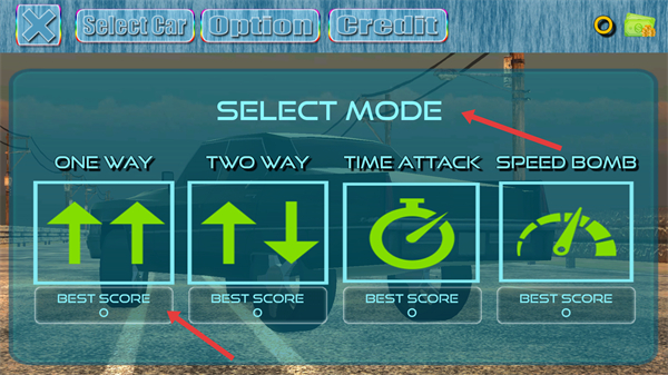 2、進入模式選擇界面,可選單向行駛、雙向行駛等玩法模式,不同模式對應不同的賽車規則。