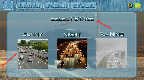 3、在場景選擇界面,可切換晴天、夜晚、雨等天氣場景,不同場景會影響駕駛難度如雨天路面更滑。