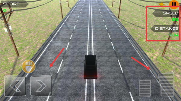 4、進入游戲后,通過左右按鈕控制車輛變道,躲避障礙的同時,右上角會顯示當前速度、行駛距離等數據,目標是盡可能安全行駛更遠距離。
