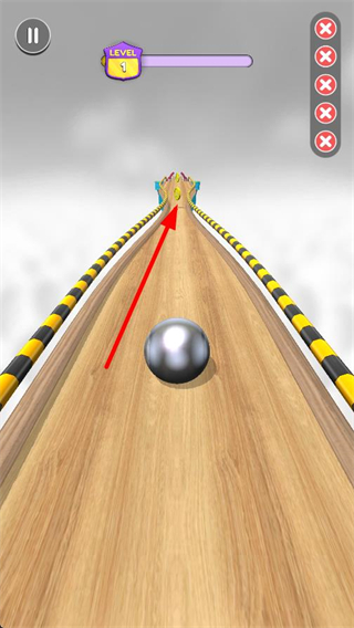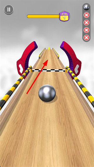 1、在LEVEL1關卡,操控金屬球沿木質賽道向前滾動,賽道兩側有黃黑條紋護欄,需朝著前方目標推進,開啟闖關進程。