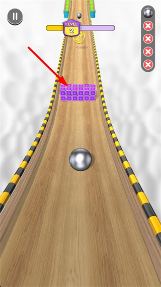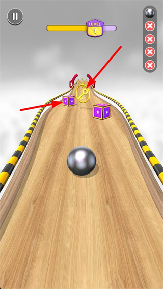 2、滾動的過程會遇到紫色方塊和黃顏色道具,金屬球經過這些物品時可收集它們,同時注意賽道上的機關,持續推進闖關節奏。