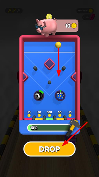 1、裝置內有金屬球和不同分值區域,點擊DROP按鈕讓金屬球下落,落到對應區域可獲得相應金幣,積累收益。