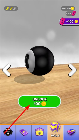 2、在球體選擇界面,看到黑色帶眼裝飾的球體,點擊UNLOCK按鈕花費100金幣,即可解鎖這個新球體,豐富可用的滾球類型。
