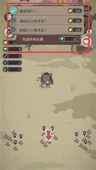 1、進入野生馴獸師界面,先查看頂部任務列表,如離開洞穴、獵殺老鼠等,操控角色移動至目標區域,開啟任務對應的互動流程。