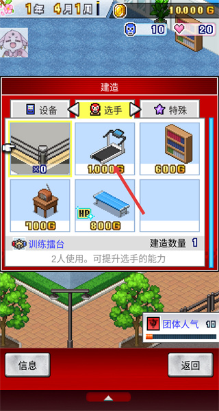 2、在建造頁面中切換到選手分類,選擇合適的訓練設施,查看其所需的資源,確認資源充足后準備進行建造。