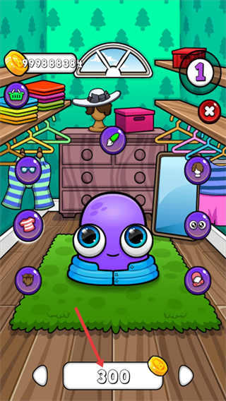 3、界面底部顯示300數值的按鈕,點擊后可消耗對應貨幣來解鎖內容,為紫色角色獲取裝飾或狀態提升,需點擊該按鈕,完成交互以推進角色的裝扮進度。