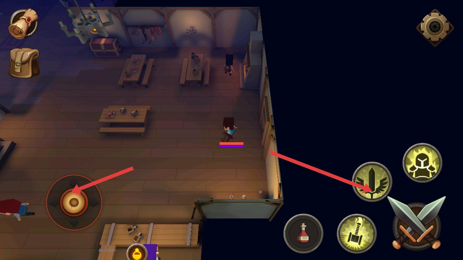 3、進入酒館場景后,點擊左側的交互按鈕,再結合右側的功能圖標如武器標識,可進行裝備相關的操作。