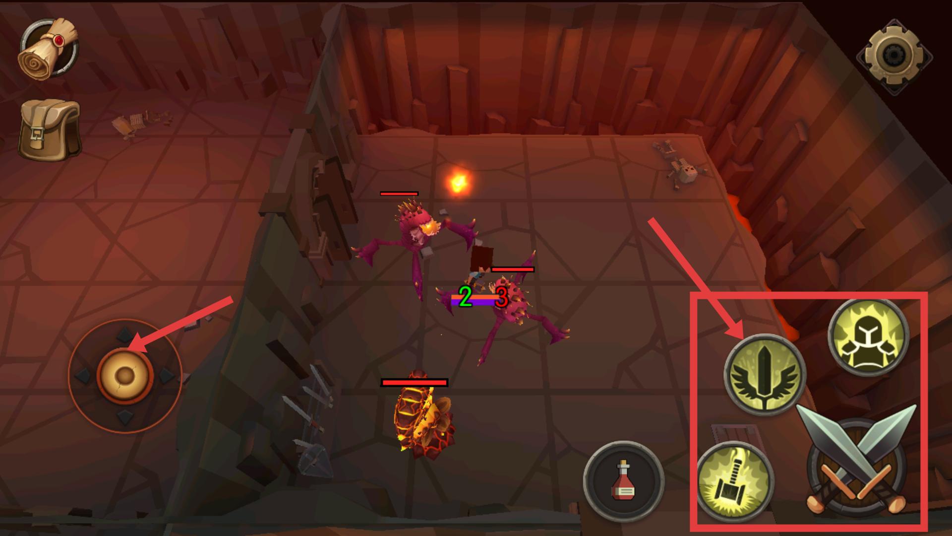 4、進入戰斗場景后,操控角色與怪物對戰,利用右側的功能按鈕如武器、藥劑輔助戰斗,擊敗敵人推進關卡。