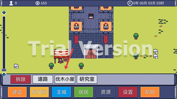 2、進入建造界面后,會顯示【拆除】【道路】等選項,可按需選擇對應建筑類型。優先選擇與資源采集相關的建筑,比如伐木小屋,助力快速積累初始資源。