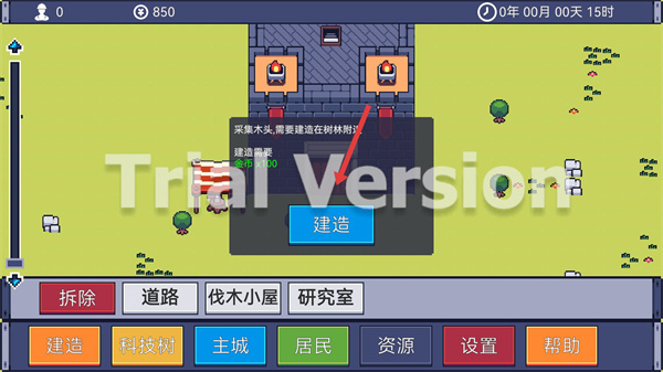 3、選定建筑后會彈出建造提示,需確認建筑所需條件,比如伐木小屋需100金幣且建在樹林附近。滿足條件后點擊【建造】,即可完成該設施的部署。