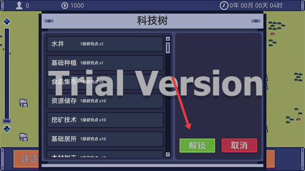 4、打開【科技樹】界面,可看到各類科技選項,每個選項需消耗對應研究點解鎖。初期優先解鎖基礎類科技,比如水井、基礎種植,提升資源生產效率。