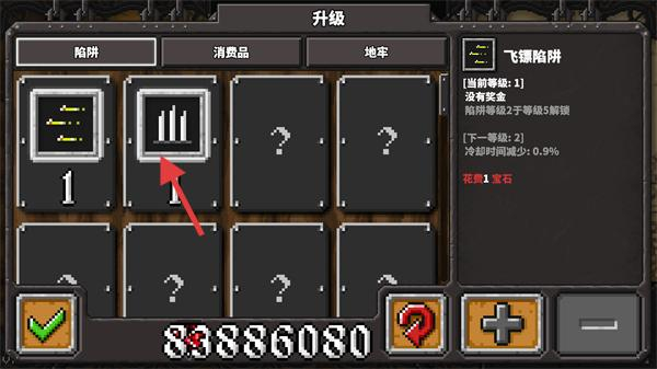 2、在升級陷阱界面,選中飛鏢陷阱可查看升級詳情當前等級1,消耗1寶石升至2級。