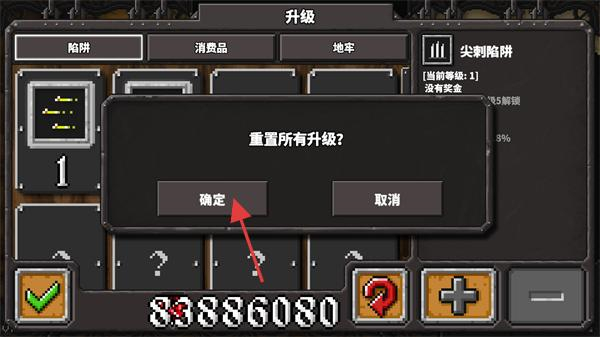 3、彈出重置所有升級的確認框時,點擊確定可重置已升級的陷阱等內容,便于重新規劃升級策略以適配不同關卡。