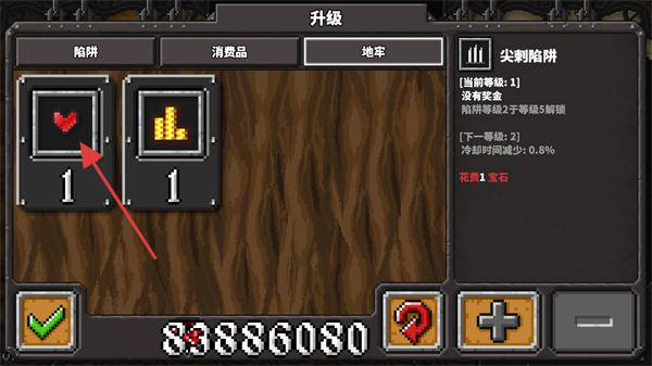 4、支付寶石升級陷阱后,可查看地牢相關道具如心形、金幣類物品,這些道具可用于強化地牢探索能力或輔助陷阱養成。