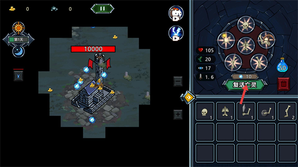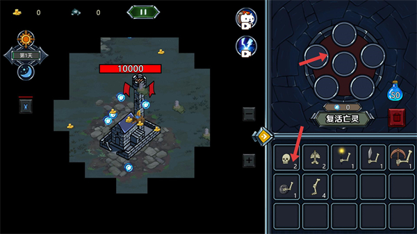 2、進入關卡后,通過右側界面選擇亡靈如骷髏類單位,點擊復活亡靈將其召喚至戰場,目標是守護核心建筑。