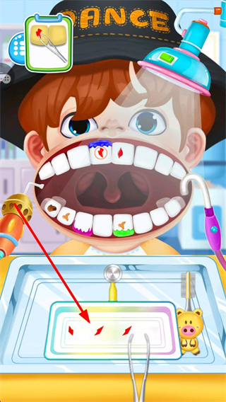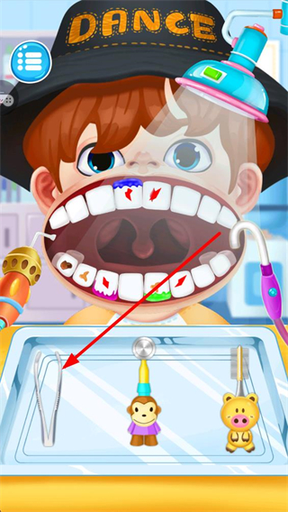 1、進入游戲界面,選擇托盤內的工具,針對牙齒上的污漬、蛀斑等問題,使用對應工具進行清潔或修復操作,推進診療流程。