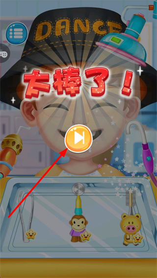 4、完成所有牙齒的診療操作后,會顯示太棒了的通關提示,點擊播放按鈕即可進入下一個診療關卡。