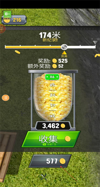 4、滑行結束后進入結束頁面,看到174米的新紀錄,確認獎勵數值,點擊底部收集按鈕領取本次游戲獎勵。