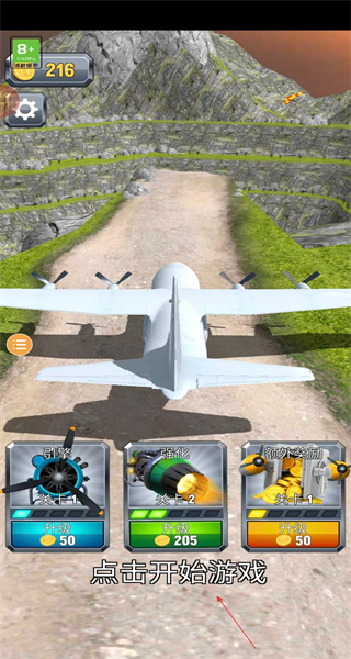 1、打開游戲后,進入初始頁面,查看飛機與金幣信息,找到底部點擊開始游戲按鈕,點擊該按鈕開啟挑戰。