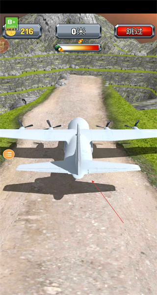 2、進入游戲開始頁面,看到距離顯示0米,確認進度條與跳過按鈕,等待飛機進入滑行狀態,準備操控滑行。