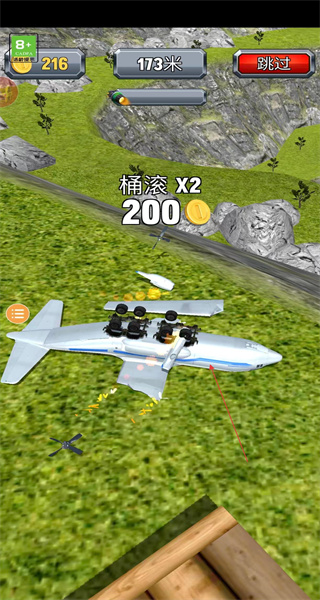 3、游戲進程中,觀察滑行距離到173米,獲取桶滾獎勵與200金幣,繼續操控飛機保持滑行狀態。