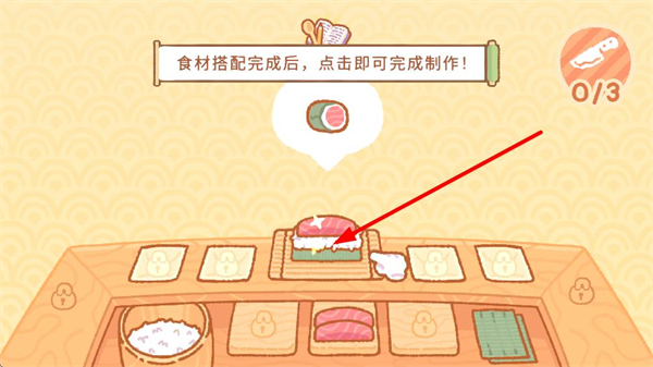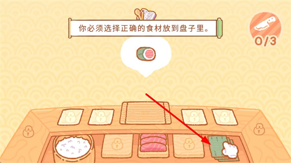 1、進入游戲后,根據提示的壽司樣式,從下方食材區選擇對應的材料,比如海苔、米飯、三文魚等,放到上方的操作盤上。