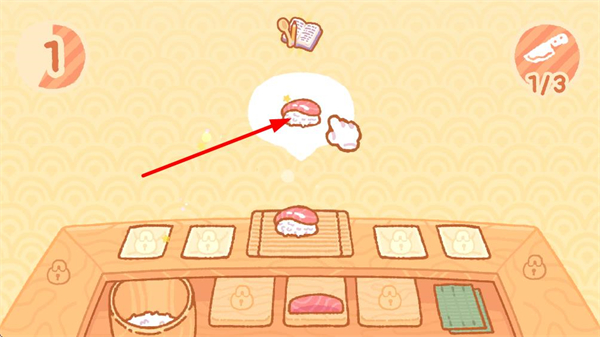 3、每成功制作一份壽司,右上角的進度會更新,需按要求完成3份壽司的制作,逐步推進關卡進度。
