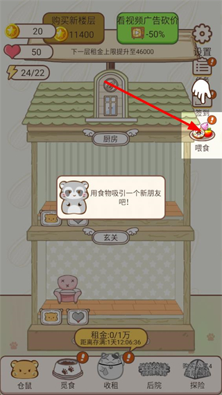 1、進入游戲界面,點擊喂食按鈕,選擇甜甜圈等食物進行投食,可吸引新的倉鼠住客入住公寓,豐富公寓的居住成員。