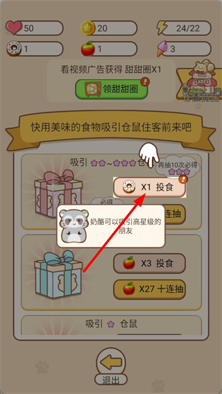 2、投食界面,消耗對應食材進行投食操作,不同食材能吸引不同星級的倉鼠,奶酪等食材可吸引高星級倉鼠。