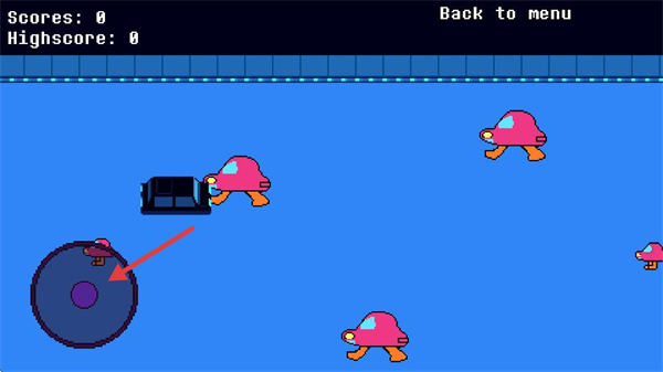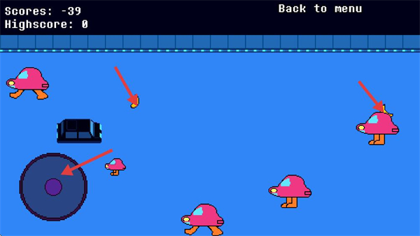 4、若被敵人擊中會扣除分數如當前得分-39,需更靈活地走位閃避,結束后可點擊BacktoMenu返回菜單,重新挑戰提升成績。