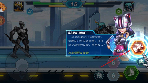 2、當機甲核心能量充滿后,查看界面提示了解覺醒技能,點擊釋放技能按鈕,觸發超強的覺醒攻擊,利用該技能快速對敵方造成高額傷害。