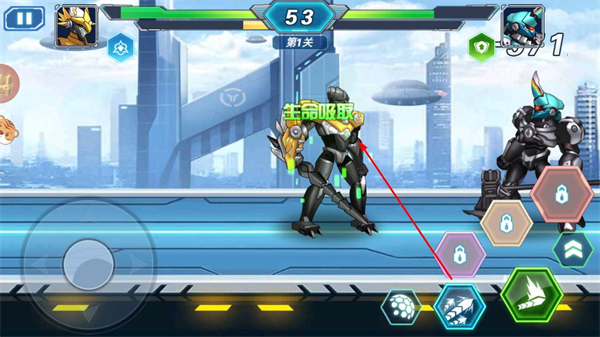 3、戰斗過程中留意敵方狀態,繼續使用普攻或技能攻擊,當敵方機甲觸發生命吸取效果時,及時調整攻擊節奏,持續壓制敵方直至其生命值清空。