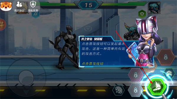 1、進入游戲操控機甲角色,查看界面提示了解普攻功能,點擊普攻按鈕發起基礎攻擊,借助該方式攻擊敵方機甲,逐步消耗對方的生命值。